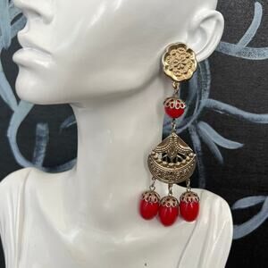 Stunning Red Coral Gold Tone Bohemian Statement Chandelier Earring