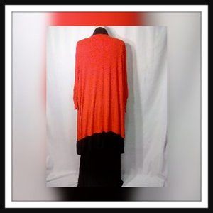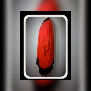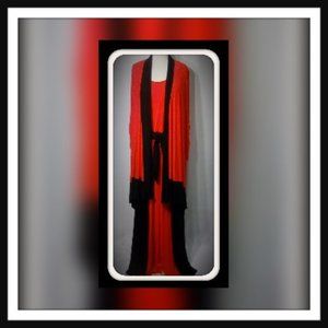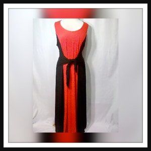 Liz Lange Two piece dress and jacket in a beautiful red and black - design and composition of dress is so very figure flattering, loose 20 pounds instantly and look two inches taller. Dress is maxi length and jacket is knee length. Self belt can be tied in front or back. Outfit is preowned and gently worn and loved. It has way too much life left to stay stuck in a closet any longer. Will you be that lucky one?