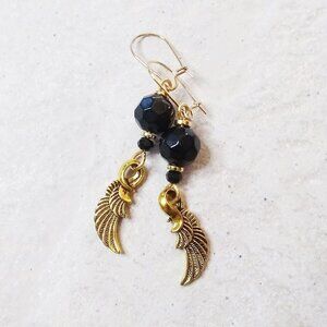Nice sized dangle earrings made with antique gold colored Wing Charms, black faceted glass + crystal beads and gold plated hardware.