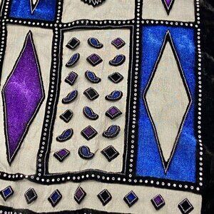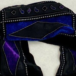 Black sheer with cut-outs; cobalt blue and purple velvet accents