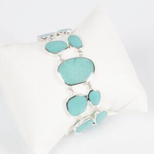 Elegant solid sterling silver bracelet featuring organic-shaped turquoise stones in varying sizes, beautifully bezel-set for a natural, earthy look. The bracelet has a total gross weight of 25.5 g and measures 7.9” in length, secured with a sturdy lobster clasp. The striking turquoise tones make it a versatile accessory that pairs effortlessly with both casual and dressy outfits.