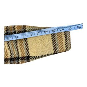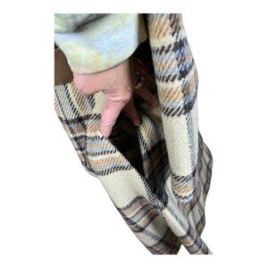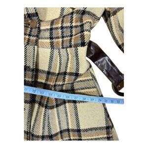 A beautiful vintage brown and tan plaid trench coat with suede accents. It has an attached belt, is fully lined, has pockets, and has a button front.