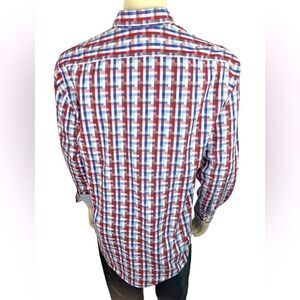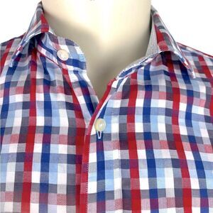 Worn once!! In a vibrant patriotic plaid, this long sleeved casual dress shirt from Thomas Dean features a check in red, shades of blue and white with complimentary fabric in light blue and white grid inside the collar and cuffs, with white mother of pearl buttons. Like new condition, 100% cotton, the size large measures:
