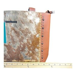 • Purse: Rich brown leather with a gold-speckled cowhide design