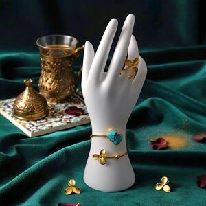 This exclusive set offers an exquisite combination of artisanal fashion jewelry with luxurious yellow 18K gold plating. Handcrafted by expert Turkish artisans, this set features a ring, earrings, and bracelet adorned with a captivating turquoise gemstone. Durable brass bijoux guarantees that this set will remain an elegant addition to any jewelry collection. A timeless expression of style and sophistication this is the perfect accent to any look. With its bold and unique design, it is sure to make a statement wherever it goes.