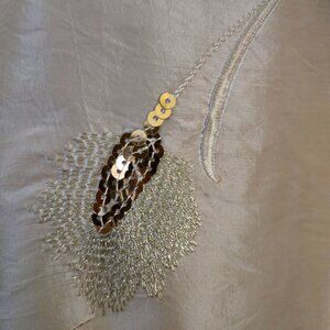 This stunning beige kimono features intricate sequin embroidery and an Asian-inspired design. It lacks tags and has notable stains in the armpit area, but its unique style remains captivating.