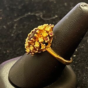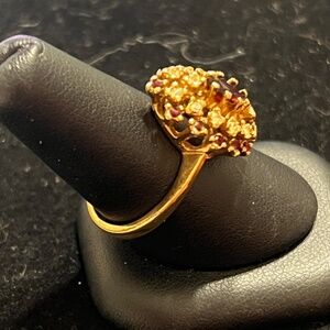 Add a touch of vintage elegance to your jewelry collection with this exquisite 14K HGE Lind ring. This beautiful piece features a striking ruby red faux gemstone set amidst a cluster of intricate gold-tone floral designs. The ring is stamped "14K HGE Lind," indicating it's a high-quality gold electroplate from the renowned Lind company. Perfect for collectors or those who appreciate unique, timeless fashion jewelry, this ring is sure to make a statement.