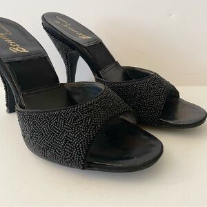 Stunning Vintage 50s Black Beaded Springolator High Heel Mules. Purchased years ago from the estate of Maria Helen Alvarez Smith here in San Diego. She was an impressive woman with many accomplishments she help fund the built of Disneyland hotel. You most google her. No size in these tiny beauties. Measures are from toe to heel inside the insole 9” across the outside sole 3” heels 4”