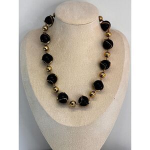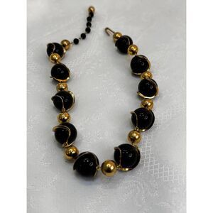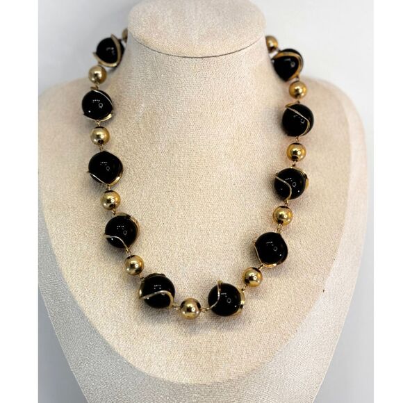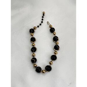 This is a beautiful vintage Coro piece. It features black lucite beads with swirls and gold spacers. Its in great condition with slight wear on the hook clasp.