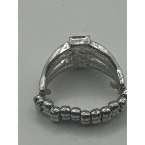 This vintage ring features a stunning pink gemstone set in an elegant multi-band silver design. The beaded band adds a unique touch, making it a timeless piece for any jewelry collection. The sparkling accents enhance its charm, offering a blend of sophistication and classic beauty.