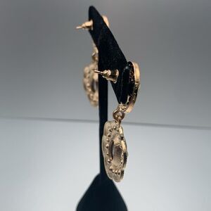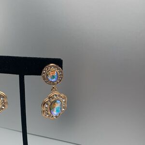 Stunning Aurora Borealis-coated Glass cabochon earrings surrounded by Glistening faceted clear crystals, in Gold wash metal framework