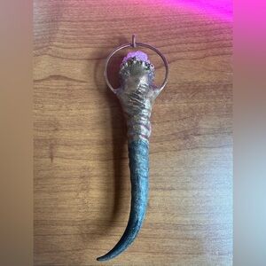 This stunning statement necklace features a unique crystal and labradorite horn pendant, set in copper perfect for adding a touch of uniqueness to any outfit. 7 inches long. The pendant is handmade artisan made by Electra Relics (check him out on instagram) and is one of a kind. Each of his pieces is a one of one copper electro-form piece. Purchased from him in Charlotte, NC at the annual Oddities & Curiosities Expo. Everyone always compliments me when I’m wearing his pieces. They are so beautiful and unusual.