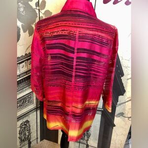 Stunning colorful blouse by Choices in size 1X. I did not find a label with material information or laundry instructions. This blouse is sheer! Excellent condition.