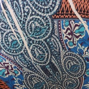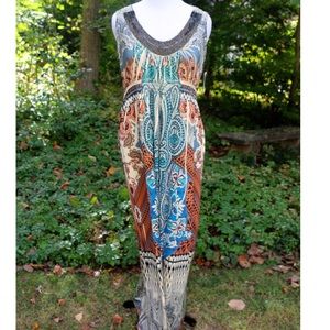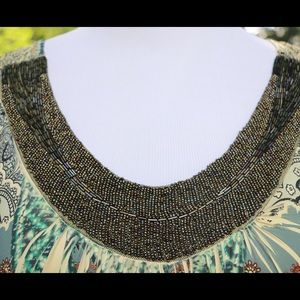 This is sadly a reposh. It's brand new, and it looks awesome on me except for the length. (I'm hardly 5'1"). It's the softest flowiest material, beautiful print and beading. Sad to sell it, but someone else will love and cherish it! 💕 I'm a 16-18 in dresses and it fits me perfectly, but it's all stretch, so would a 20 easily, possibly a 22. I'll measure.