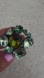 Stunning brooch with light emerald green multi shaped crystals. An olive green jewel in center.