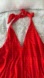 Elegant poppy red halter dress featuring a stylish gold belt. Perfect for special occasions. Bebe dress is bodycon mini dress in cotton underneath and a chiffon high low overlay skirt . Gold belt and halter tie make this a stunner !!