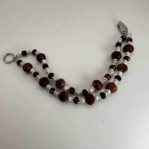 8" long with a silver tone and magnet fold over clasp that looks brand new!