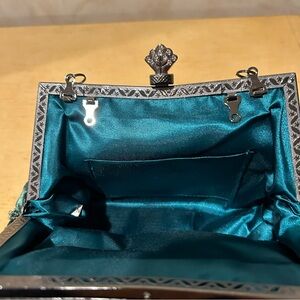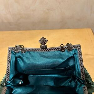 Stunning emerald green beaded satin evening bag with rhinestones accents