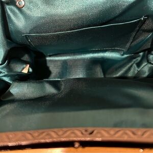 Emerald green satin evening bag with intricate beading and rhinestone accents with rose pattern