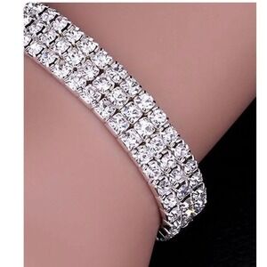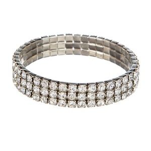 Stunning expanding stretch bracelet made up of silver tone metal and three rows of rhinestones. Stones are on the big side and all are clear with no cloudiness.