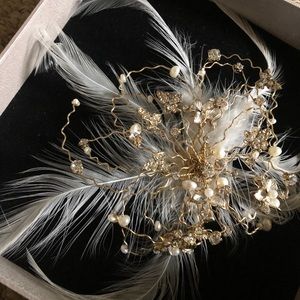 Absolutely gorgeous hair clip, perfect for a wedding. Unused. It has wispy white feathers, natural pearls, crystals, and gold wire. Alligator clip underneath, very light. I was going to wear this for my winter wedding, but my husband and I ended up eloping for various reasons in the Spring, and I used flowers in my hair instead. Plastic lid is a bit dusty and has a crack in the corner from storage. But clip is in perfect condition. Would love for a bride to enjoy this piece!