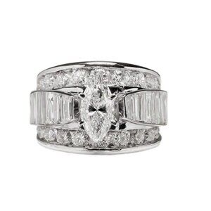 Stunning multi-row ring with marquise cut cubic zirconia center stone, complemented by round and baguette accent stones