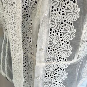 By Abigail Love organza blouse with lace details. Puffy sleeves. Pearl buttons and lace trim details. 22.5” shoulder to hem 19” flat measurement armpit to armpit. Worn 1x