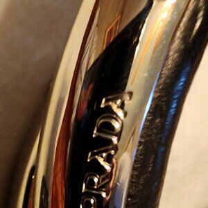 This rare Prada handbag is a true collector's item with its vintage design and limited edition status. The exterior is made of high-quality buttery beige leather with a pebbled finish and buckle and studded accents. The bag features double handles and a zip closure, making it perfect for any occasion, whether it be formal, business, or for travel.