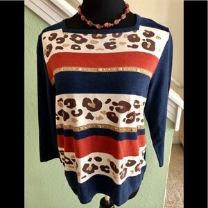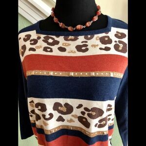 Beautiful sweater by Alfred Dunner in size Petite extra large. Mixture of cotton, rayon and some lurex. Excellent condition.