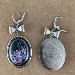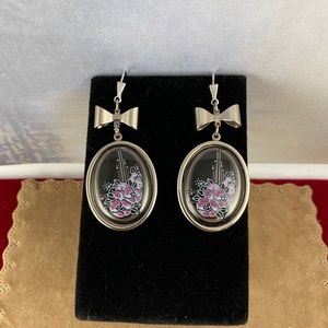 Stunning vintage/retro Michaela Frey leverback earrings. They feature large Silver tone ovals with black, pink and white floral enameling. The earrings measure approximately 2 1/4" long (to the top of the leverback and 1 1/8" wide. They are signed on the back MICHAELA FREY and in very good vintage condition with only very minimal signs of wear. A great addition to any vintage collection