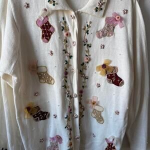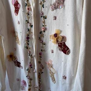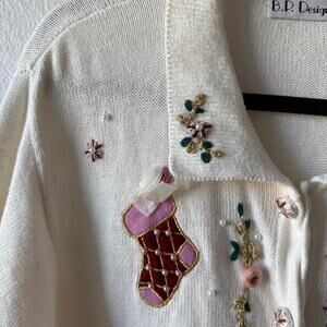 Stunning vintage White Christmas button up cardigan sweater with a pink theme of beaded, embroidered, and pearls. The details on this are so good!