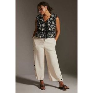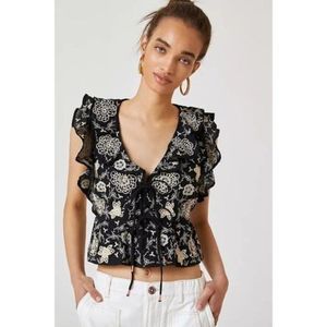 Stunning Anthropologie Ruffled Embroidered Button Up Sleeveless Crop Top Black M
