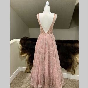 Capture the attention in this absolutely beautiful gown.The fitted bodice is strikingly designed with bead embellishments, framed with a flattering, sexy deep V-neck and open back. Lace glitter fabric, sparkling and eye-catching.