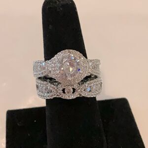 Absolutely stunning wedding ring in sterling silver with matching band. Pictures do not do this ring justice! Huge center stone held up by encrusted round pedestal set on a band that is just indescribable with matching band. This is a show stopper and there is only one. Size 7