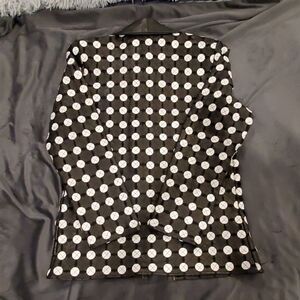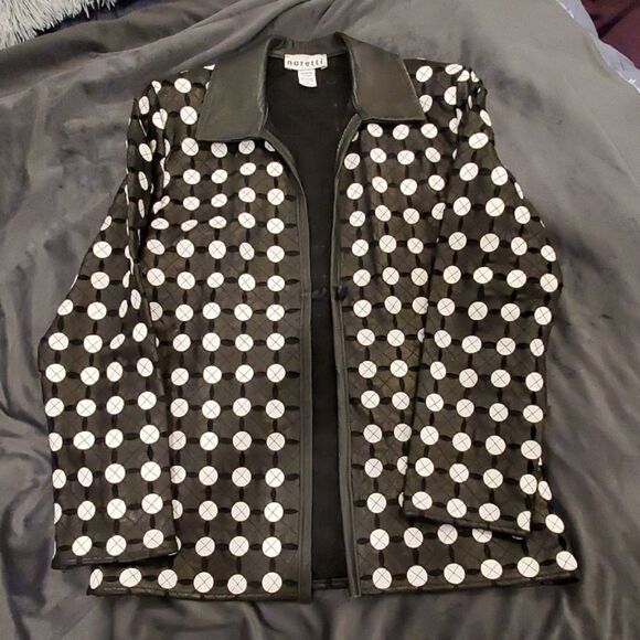 Stunningly unique Nuretti leather cutout jacket size M. Made in Turkey with 1 button enclosure in the middle. Black and white cutout detail, plain black collar and light shoulder pads. Size tag not attached, but will be included. Such a great unique piece to add to your wardrobe!
