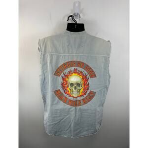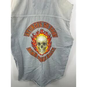 Biker - Moto Sturgis 2002 Denim Cutoff Vest Light Wash. Y2K Biker Moto Style. Skull Flames Graphic. Button Front. Big Back Graphic.