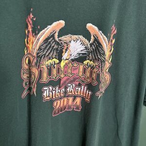 Show off your love for the legendary Sturgis 2014 event with this stylish T-shirt. Featuring a bold green color and a striking graphic, this T-shirt is perfect for any biker or motorcycle enthusiast. Whether you're hitting the open road or simply hanging out with friends, this Sturgis 2014 T-shirt is sure to turn heads and make a statement. Great piece in great condition!