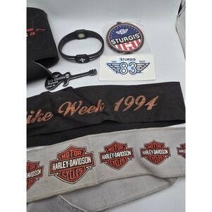 Lot of random Sturgis and Harley Davidson items! See pictures for details. Two headbands, some motorcycle parts, two keychains, a bracelet, a drink holder.