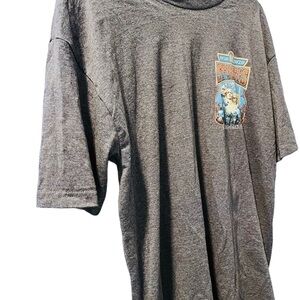 This is a gray Sturgis biker t-shirt designed for men. It has short sleeves and a regular fit, with a size type and size of regular and large, respectively. The t-shirt is themed around the Sturgis Motorcycle Rally's 80th anniversary and features classic biker and motorcycle designs.