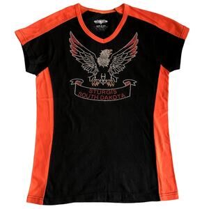 Sturgis themed T-shirt in good condition, it has some wash and wear, also the hem line seems a little longer on the right - see photos, but there's no significant loss of studs on the eagle and there's no holes, stains or tears. App'x 17 inches pit to pit, 16 across at waist and 24.5 inches long.