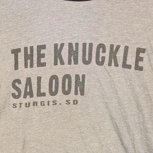 Sturgis apparel for ladies in a cute ringer tee. MEASUREMENTS: chest is 19 inches across and neckline to shirttail is 24 inches long. I would say this fits like a medium or a generous small. Comes from a smoke free home.