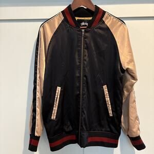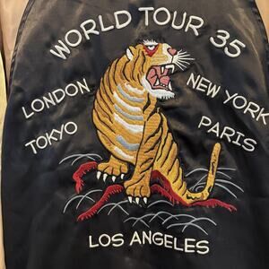 Stylish Stussy bomber jacket. Features bold tiger embroidery. World tour cities listed. Comfortable and trendy.
