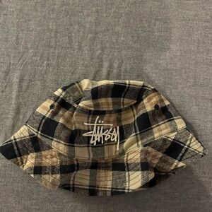 Stylish Stussy bucket hat with a checkered pattern with navy beige and white