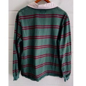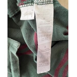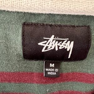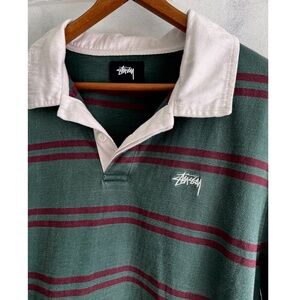 Classic Stussy polo with green and red stripes. White collar adds contrast. Perfect for casual wear.