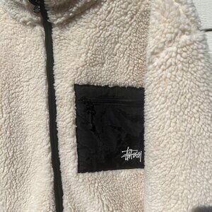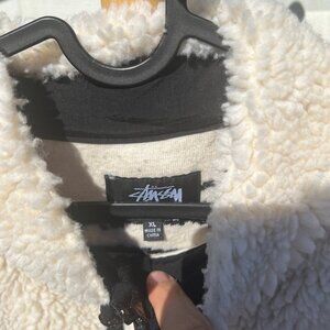 Rare Stussy Venus Jacquard Sherpa Jacket. Features a black jacquard-style outline of Venus on the back, integrated into the sherpa fabric. Zipper pocket on the chest with the embroidered Stussy logo. Zip-up with cozy stand collar.