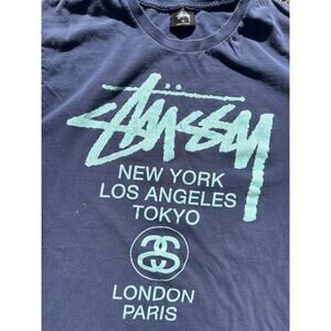 Stussy World Tour Blue T-Shirt Tee Size Med Men’s NY LA Tokyo London Paris
