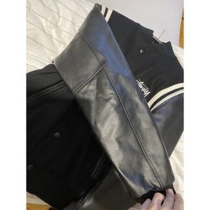 As part of SOPHNET.'s 16th anniversary celebration, the Tokyo-based brand has teamed up with Stussy on a small capsule collection, with this classic varsity jacket representing the standout piece. The garment features a black body built with 60% wool and 40% polyester, along with matching black cowhide leather sleeves and pocket trim. Dual white stripes circle the shoulders, while wool blend ribbing caps off the premium construction. Additional details include 'NO FUTURE WITHOUT A PAST" embroidery on the right chest, and "Stussy Soph Tokyo" on the left.