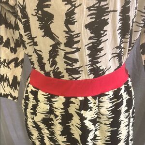 Elevate your wardrobe with this chic black and white patterned dress. Featuring a bold red accent, this dress is perfect for any occasion. Its modern design and comfortable fit make it a must-have.