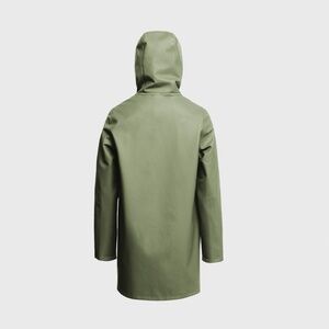 Stylish green raincoat by Stutterheim. Features a hood and front pockets. Perfect for rainy days.