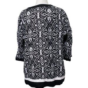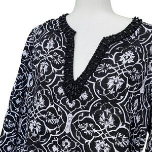 This beautiful black and white tunic from Style & Co. is a stylish and comfortable piece perfect for a casual day or a night out. It features a unique damask print and a chic beaded v-neckline.